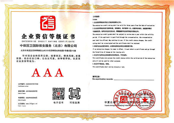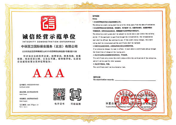 中保國衛(wèi)國際保安服務(wù)(北京)有限公司,屬中保國衛(wèi)集團(tuán)旗下子公司。能全方位的為大型客戶提供優(yōu)質(zhì)的安保、押運(yùn)服務(wù),是集人防和技防于一體的新型正規(guī)化綜合安保押運(yùn)服務(wù)企業(yè),提供人防、物防、技防、聯(lián)網(wǎng)報(bào)*、非武裝押運(yùn)等安防相關(guān)的一站式服務(wù)。 公司在國內(nèi)多省設(shè)立有分公司及分支機(jī)構(gòu),著重提升安全押運(yùn)、智能技術(shù)押運(yùn)及安全技術(shù)防范相關(guān)的服務(wù),業(yè)務(wù)范圍覆蓋全國一、二線城市、港澳地區(qū)以及海外地區(qū)。安保方面主要為政府機(jī)構(gòu)、金融機(jī)構(gòu)、企事業(yè)單位、醫(yī)療衛(wèi)生、高等院校、工業(yè)園區(qū)、大型商場、高檔住宅、智能商務(wù)樓、大型活動提供門衛(wèi)、守護(hù)、巡邏、押運(yùn)(非武裝)、安全檢查、保安特勤、私人護(hù)衛(wèi)、消防中控、安全技術(shù)防范、遠(yuǎn)洋護(hù)航等全方位服務(wù),同時(shí)面向國際市場,為中資企業(yè)在“一帶一路”沿線國家投資提供境外安保服務(wù)。 >> 更多內(nèi)容 |